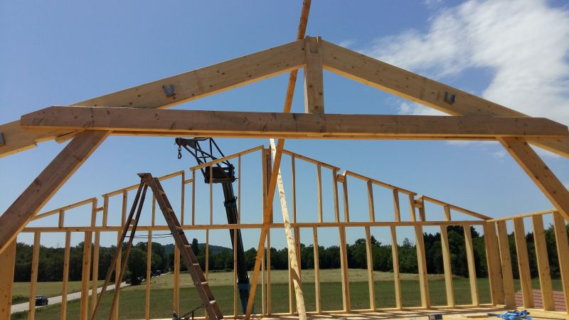 Suite à la constrution d'une charpente en bois lamellé-collé sur la commune de Soleymieu. Pour ce chantier, nos équipes ont utilisées une charpente en bois traditionnelle faite sur mesure ,elle est constituée de bois très résistant ( telle un mille feuille le lamellé-collé associe par collage à plat plusieurs lamelles de bois massif). La charpente traditionnelle possède différents composants: