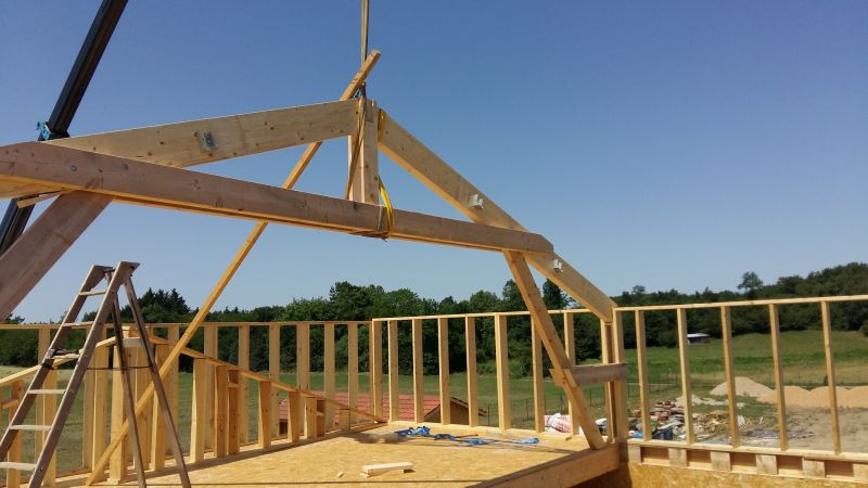 une ferme ,des chevrons ,des liteaux et des voliges .Nos clients ont préférée une charpente traditionnelle car c' est la charpente la plus utilisée pour son ésthétique et sa résistance et mérite souvent d'etre laissée apparente pour donner du cachet à l habitation.