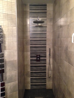 Ici rénovation d' une salle de bains dans son intégralité . Création d' une douche à l' italienne, pose de carrelage au sol et pose de faïence,éclairage,plomberie.